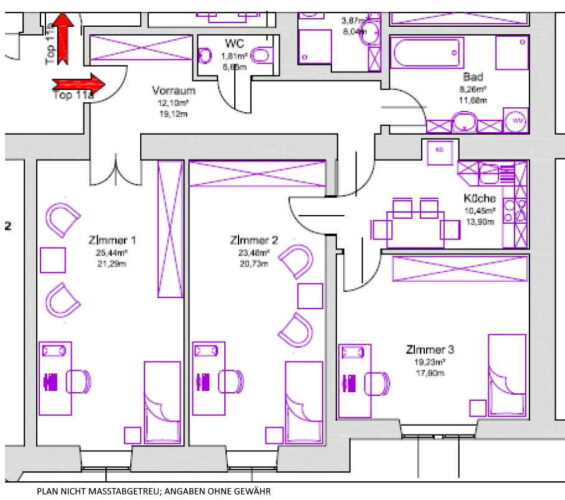 Raumaufteilung: großer Vorraum, WC mit Waschbecken, Küche, Badezimmer mit Dusche und Badewanne, 3 extra begehbare, großzügige Zimmer