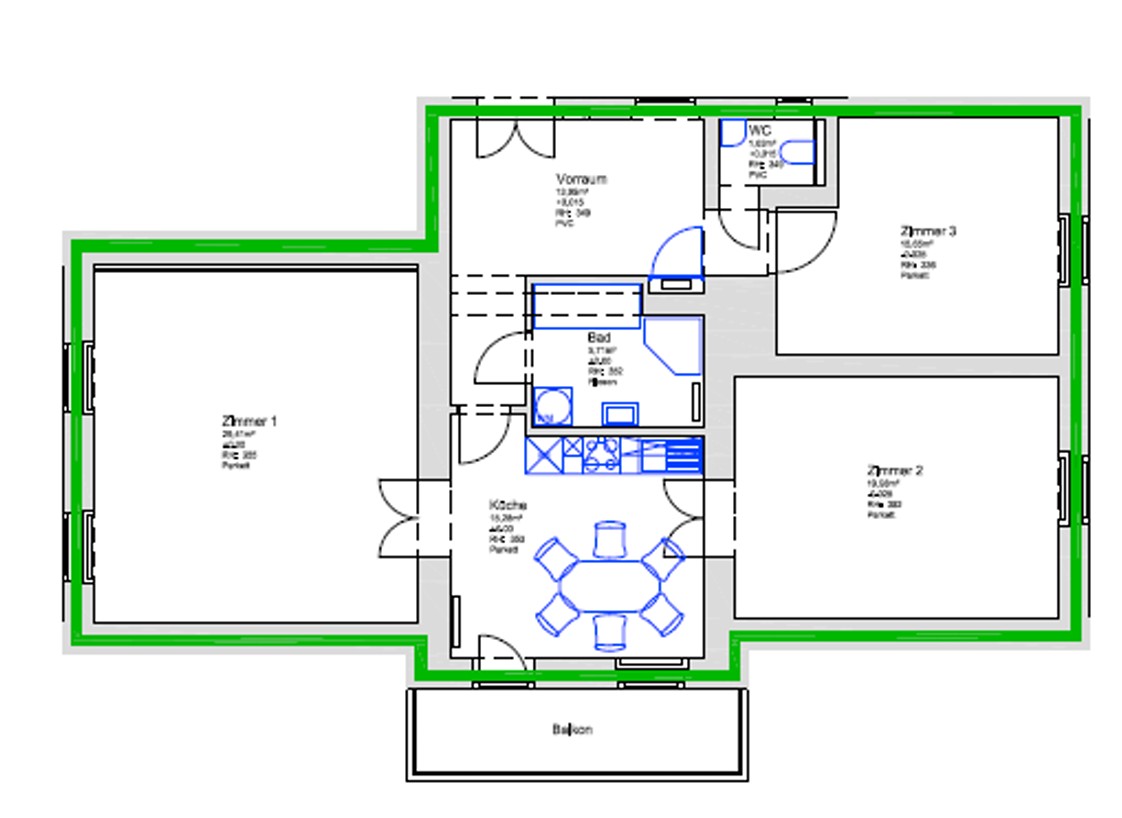 In den Räumen sind Parkettböden verlegt, die Küche, der Vorraum und die Sanitäranlagen sind verfliest.